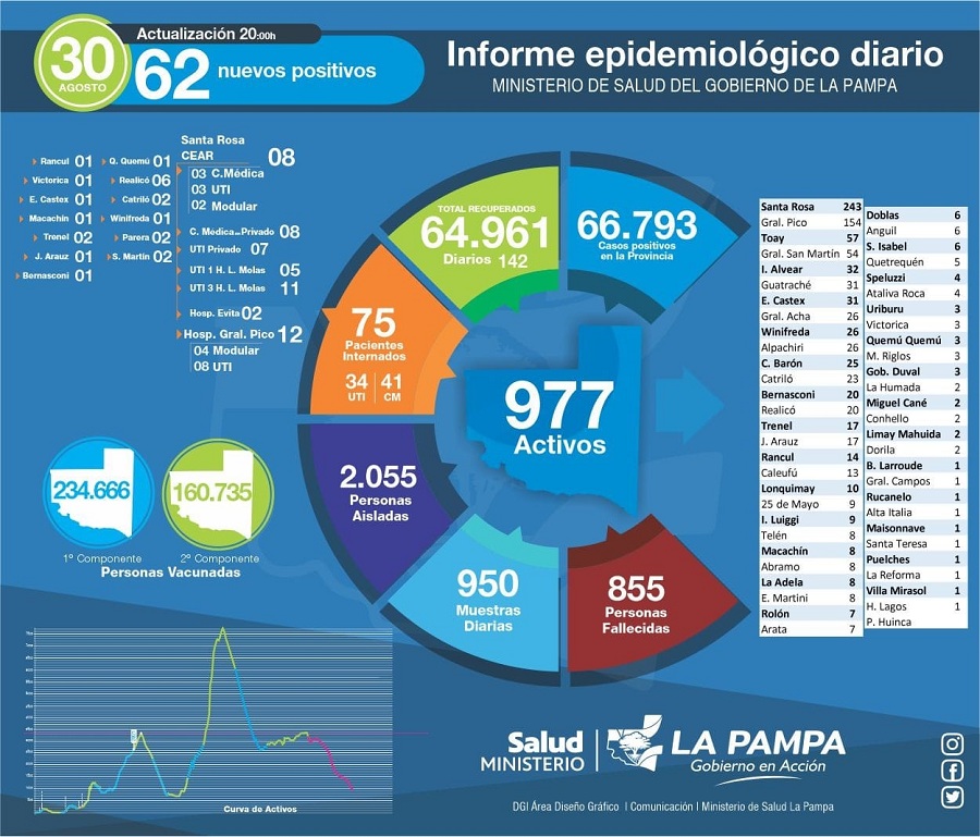 Desde el inicio de la pandemia, en la Provincia, se registraron un total de 66.873 casos positivos para COVID-19, de los cuales 938 permanecen activos, 858 han fallecido y 65.077 se han recuperado, 116 en el día de hoy. Los casos confirmados activos pertenecen a las siguientes localidades: 248 en Santa Rosa, 152 en General Pico, 54 en General San Martin, 38 en Toay, 32 en Eduardo Castex, 31 en Intendente Alvear, 28 en Catriló, 27 en Winifreda, 27 en Alpachiri, 26 en Guatraché, 25 en Colonia Barón, 24 en General Acha, 24 en Bernasconi, 20 en Realicó, 17 en Jacinto Arauz, 14 en Trenel, 14 en Caleufú, 13 en Rancul, 10 en Lonquimay, 9 en Telén, 8 en 25 de Mayo, 8 en Ingeniero Luiggi, 8 en Embajador Martini, 7 en Rolón, 6 en La Adela, 6 en Macachín, 6 en Arata, 6 en Doblas, 4 en Abramo, 4 en Anguil, 4 en Speluzzi, 4 en Victorica, 3 en Santa Isabel,3 en Quetrequén, 3 en Miguel Riglos, 3 en Gobernador Duval , 2 en Ataliva Roca, 2 en Uriburu, 2 en Quemú Quemú, 2 en La Humada, 2 en Conhello, 2 en Limay Mahuida, 2 en Dorila, 1 en Bernardo Larroudé, 1 en Rucanelo, 1 en Alta Italia, 1 en Colonia Santa Teresa, 1 en Puelches, 1 en La Reforma, , 1 en Villa Mirasol, 1 en Hilario Lagos.