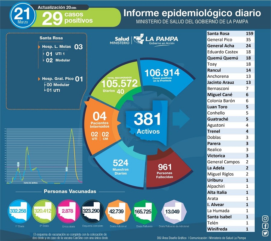 Desde el inicio de la pandemia, el Gobierno de la provincia de La Pampa realizó una fuerte inversión en equipamientos para analizar biología molecular y en capacitación de recurso humano. Con la premisa de brindar una respuesta oportuna frente a la situación pandemica y como parte del fortalecimiento de los laboratorios adquirió, en su momento cinco equipos que analizan PCR (real time) en los centros de mayor complejidad, tres de ellos fueron destinados a la ciudad de Santa Rosa y dos destinados a la ciudad de General Pico. Tambien colaboró en la puesta en funcionamiento de un laboratorio en General Pico perteneciente al subsector privado.