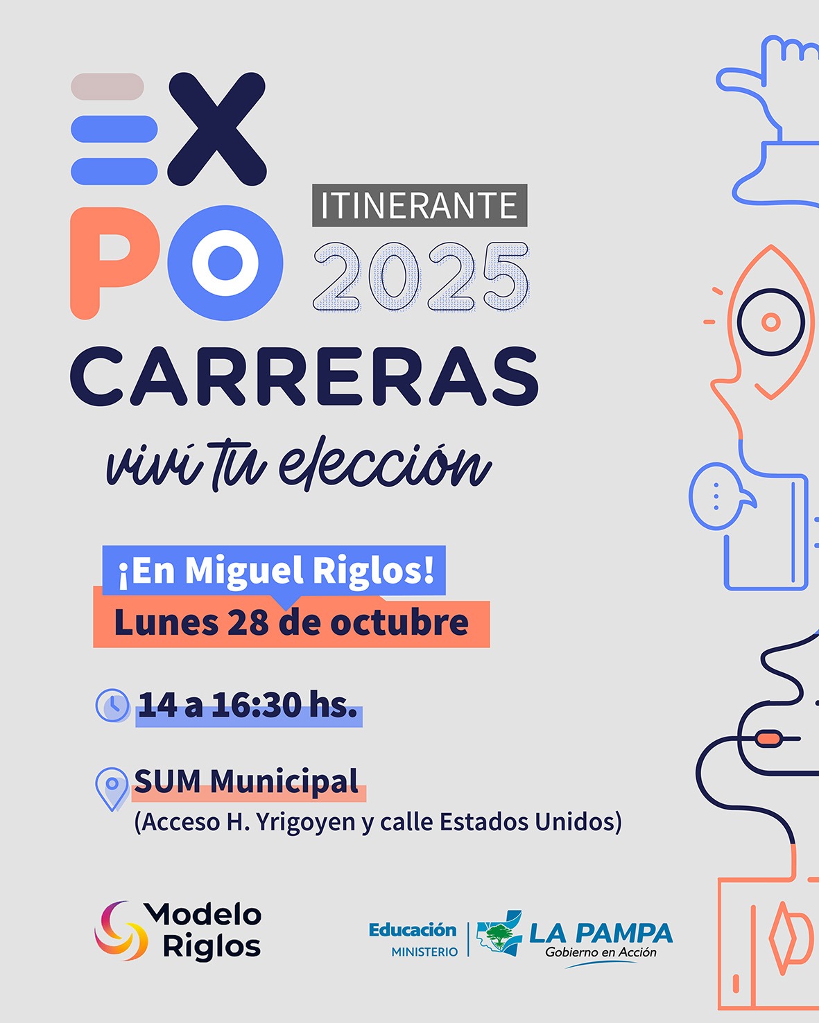 La Expo Carreras Itinerante 2025 se desarrollará el próximo lunes 28 de octubre, de 14 a 16:30, en el SUM Municipal de la localidad (Acceso H. Yrigoyen y calle Estados Unidos). La actividad es organizada por el Ministerio de Educación de La Pampa y la Municipalidad de Miguel Riglos.
